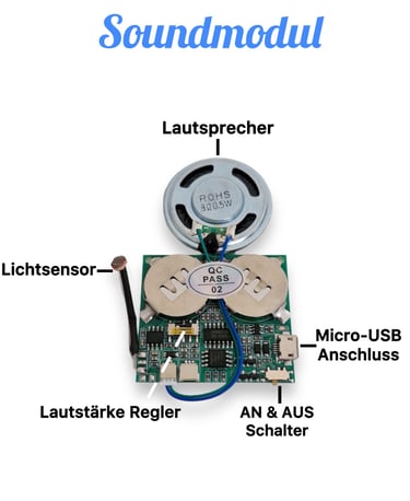 Die Soundmodule sind bis zu 8 MB programmierbar, was eine Vielzahl an Soundeffekten und persönlichen Grussbotschaften als mp3 oder wav file ermöglicht. Der integrierte Lichtsensor reagiert schnell und präzise, um den Sound automatisch abzuspielen, sobald eine Tageslicht erkannt wird. Dadurch wird ein interaktives Erlebnis gewährleistet, das sowohl Technikliebhaber als auch Bastler begeistert.